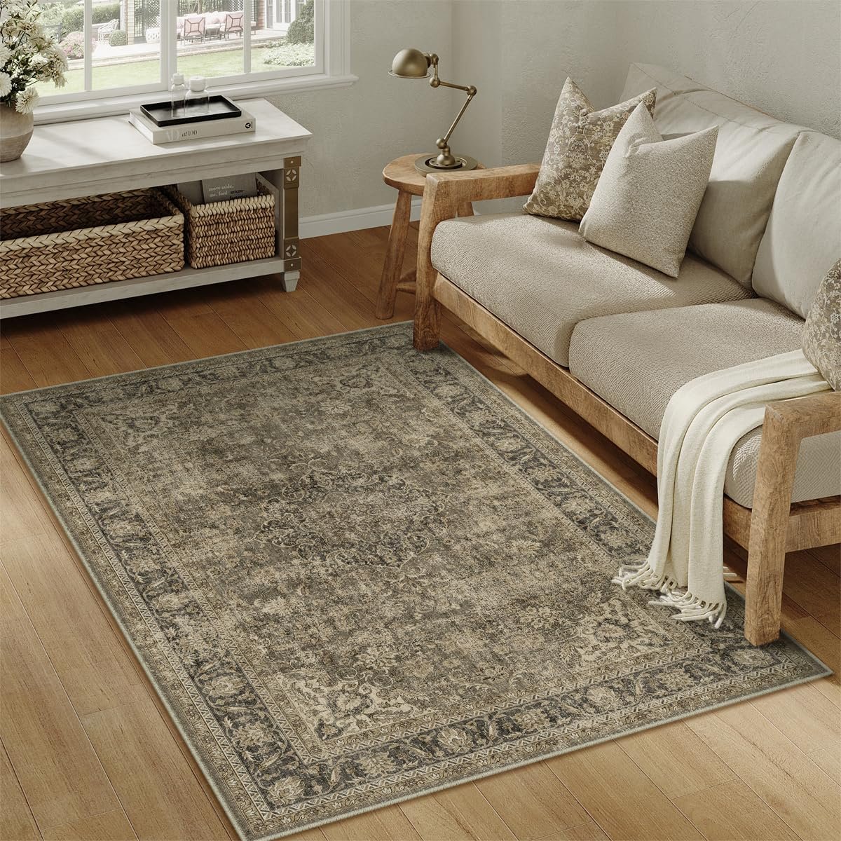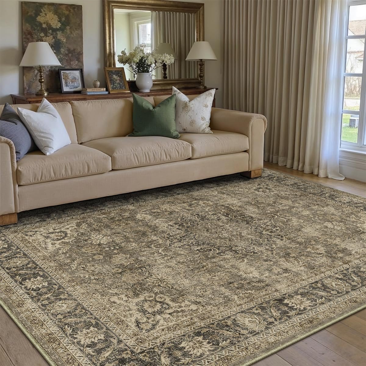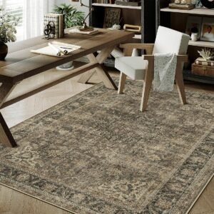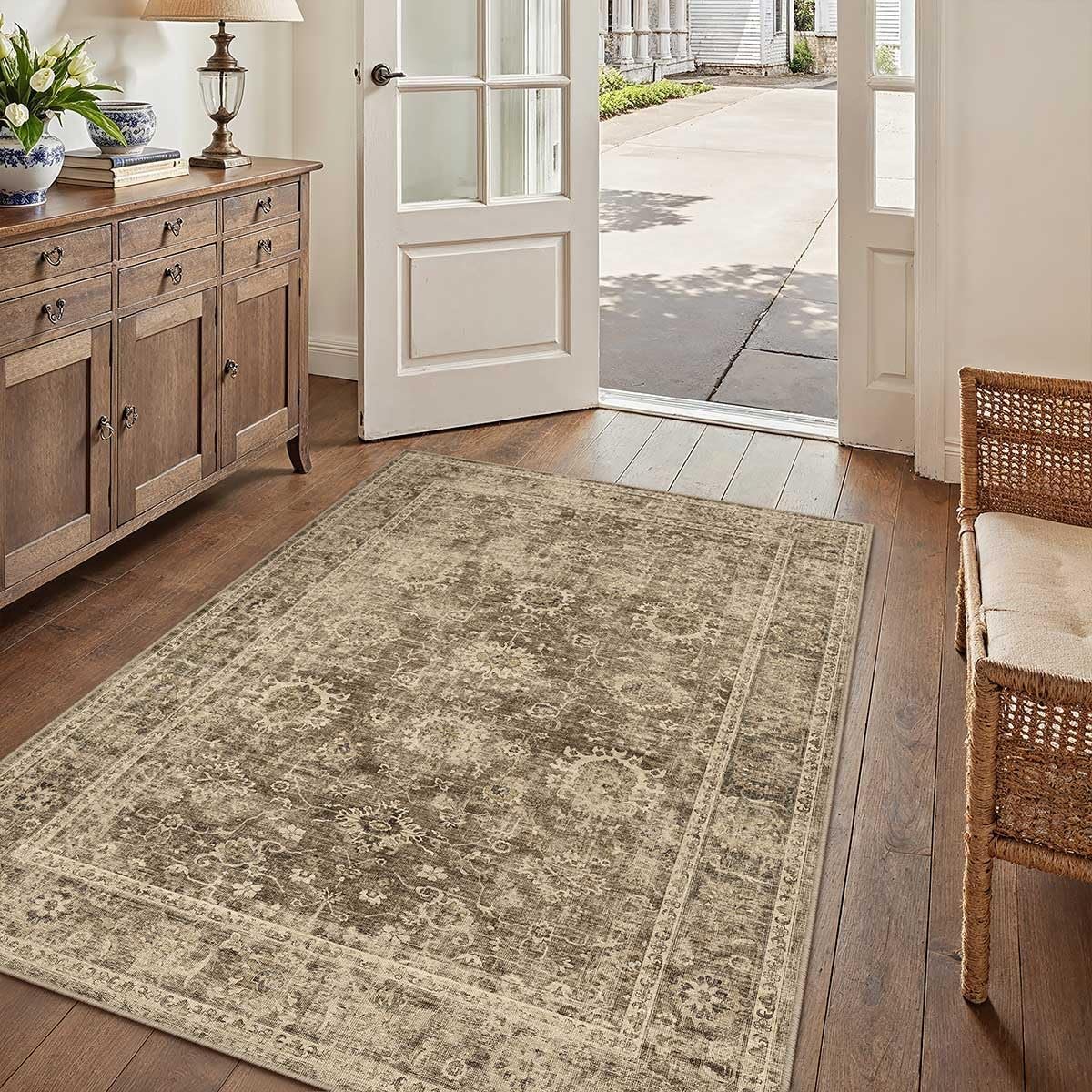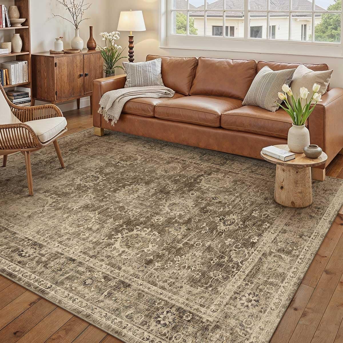 8×10 Washable Brown Area Rug Vintage Living Room Bedroom Carpet Non-Slip Soft Low Pile Distressed Indoor Large Throw Rug